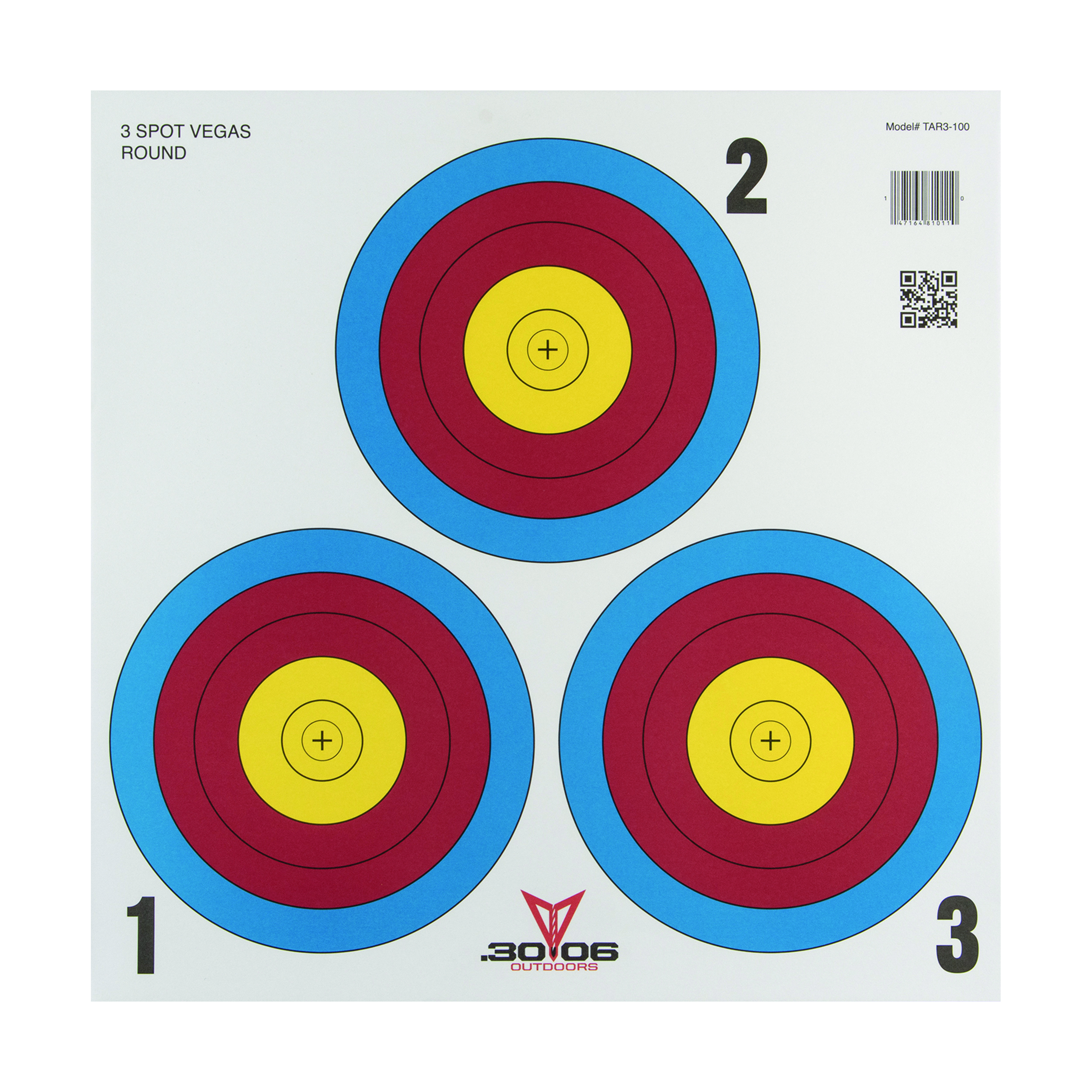 The .30-06 Outdoors 3 Spot Vegas Paper Target serves as an archery or shooting target. The targets are designed with multi-colored rings to help you track your shot and feature a bulls-eye in the center of each spot. These 3 Spot Vegas Paper Targets are notepad style to keep your spot at the range tidy. With this 100 target pack, attach and replace targets as often as you need when sighting in or practicing your shot.