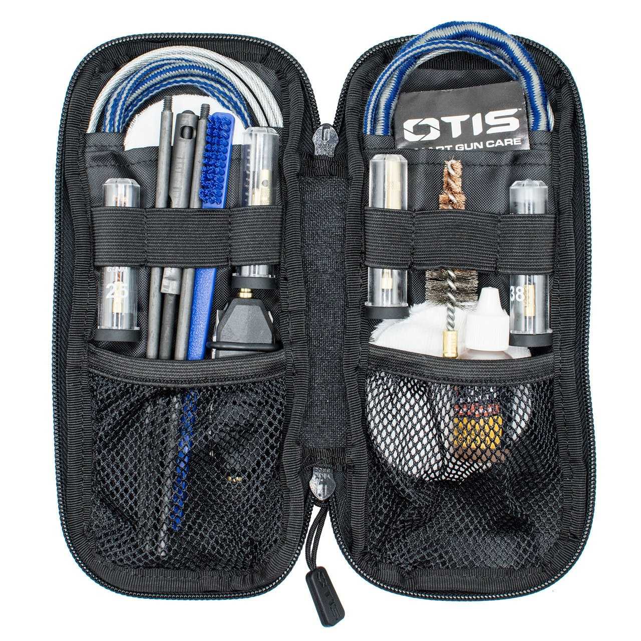 Cleans 5.56mm rifles and 9mm pistols 5.56mm and 9mm Blue Ripcords for quick, one-pass cleaning 100% cotton 2 and 3 patches and small and large slotted tip 5.56mm and 9mm bronze bore brushes with size marked on brush stem 8 and 30 aircraft grade Memory-Flex cables for proper Breech-to-Muzzle cleaning Multi-purpose tool functions as a t-handle, rod handle (attach a rod to the 8-32 threaded insert) and bit driver (insert selected bit into bit holder). Four bits included: 5/32 flat head, T20 hex, Phillips #0, Phillips #2 8-32 thread solid rod set Blue Nylon All Purpose Brush removes fresh carbon or powder residue but won’t scratch your firearm finish 5.56mm chamber brush for more precise cleaning Also includes 0.5 fl.oz. Shooter’s Choice FP-10 and instruction manual All items packed neatly in a 10x4x2 soft pack case