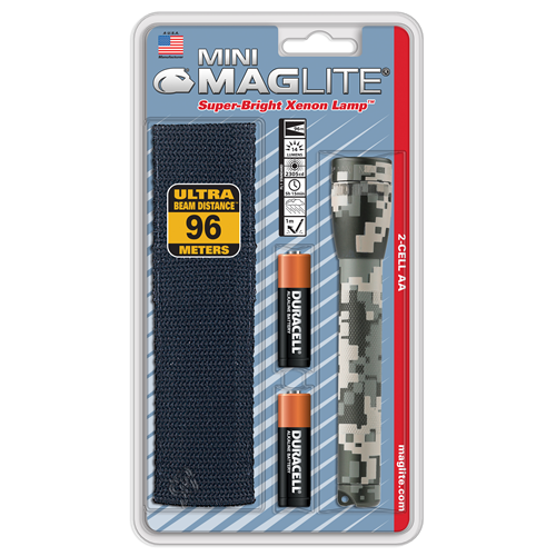 The?Mini Maglite 2-Cell AA Flashlight with Holster (Universal Camo)?from?Maglite?has a compact and durable design made in the USA. The Mini Maglite features a bright and adjustable spot to flood beam, and is powered by 2 AA batteries that last 5 hours. Constructed out of an anodized aluminum alloy, the Mini Maglite is corrosion resistant, impact resistant, and weather resistant. The combination of the universal camo print, nylon belt holster, and its size make it a perfect choice for dependable, portable, and camouflaged illumination.