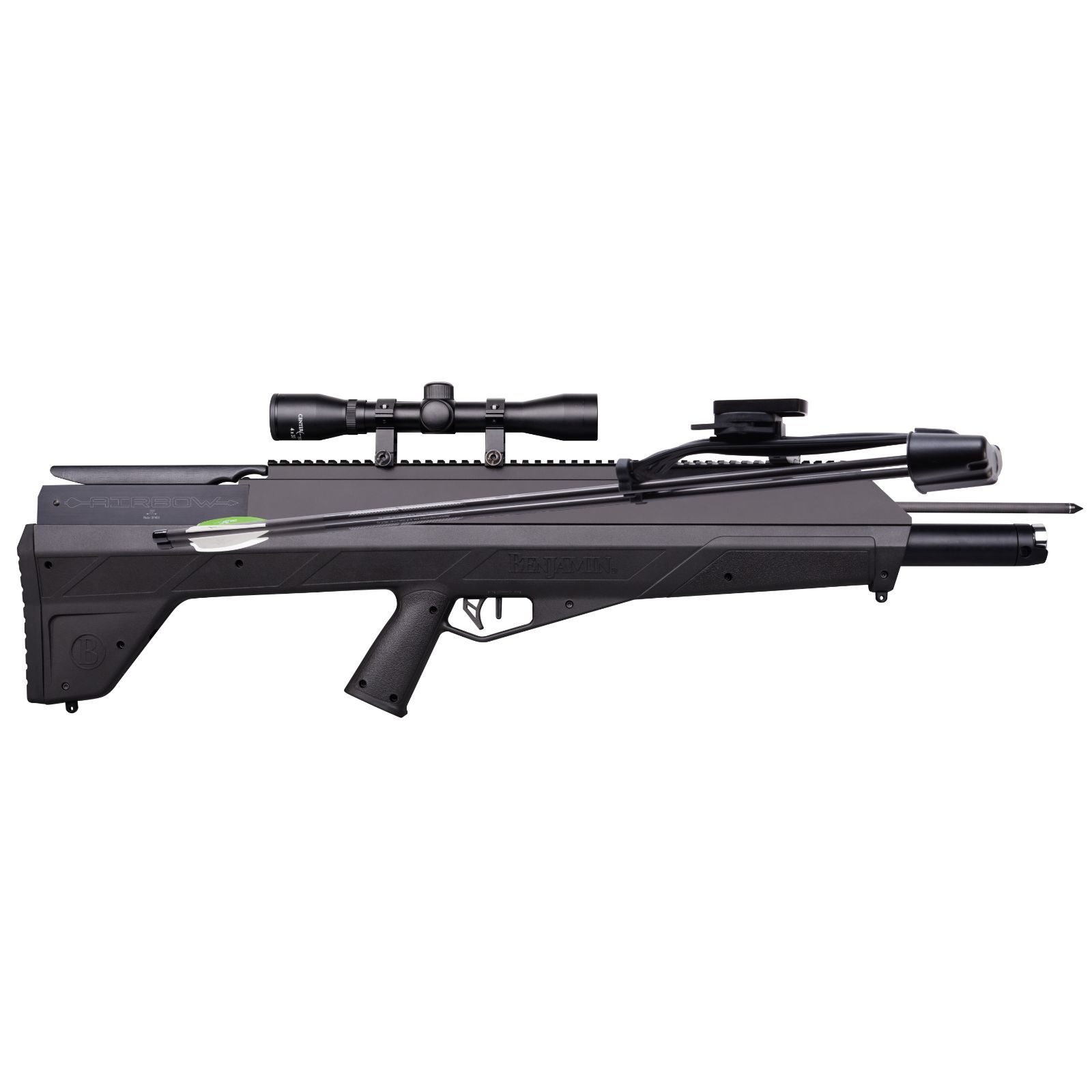 The Benjamin Airbow is a PCP Airbow powered by 3000 PSI of compressed air. The integrated pressure regulator delivers 8 consistent full power shot at 450 feet per second. The Bullpup configuration, short 33.5 inch overall length has an ambidextrous top cocking bolt. It includes three custom arrows with field tips, a 6×40 mm scope and sling and a quiver system. It delivers 168 foot pounds of energy.