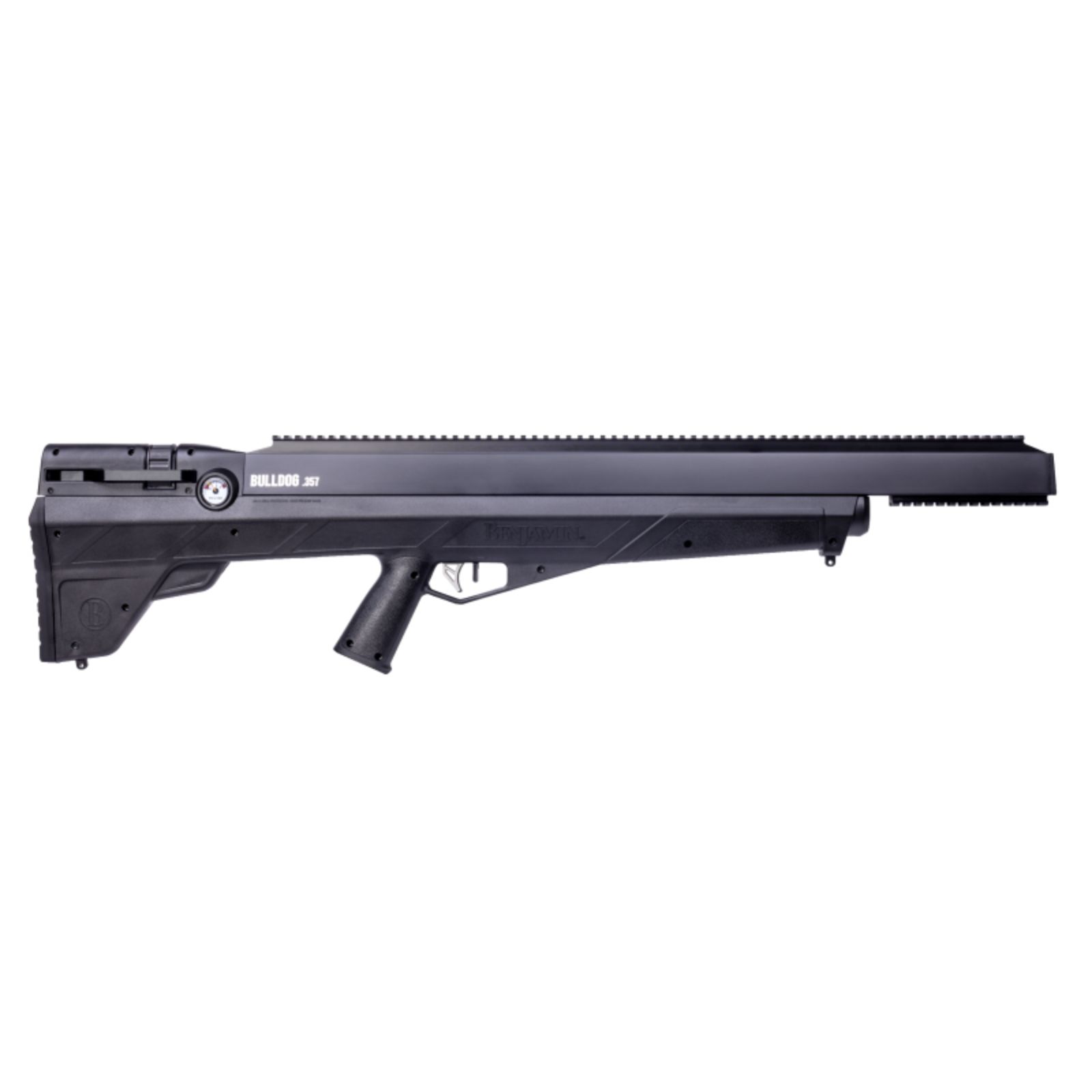 The Benjamin Bulldog 357 Caliber PCP Rifle is a 357 caliber black bolt action multi shot PCP pre charged pneumatic rifle. It shoots up to 800 feet per second and delivers 200 foot pounds of energy. The Bulldog is a Bullpup configuration and it’s overall length is short at 36 inches. It includes 26 inches of Picatinny rail and delivers 10 shots per fill. This airgun has a 3000 PSI pressure gauge and regulator, a rifled steel barrel, and a baffle-less SountdTrap shroud. It also includes a 5 shot magazine and a reversible side lever bolt for left hand shooters.
