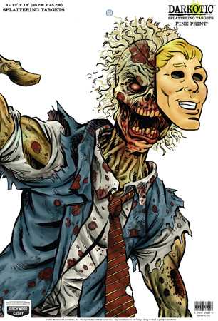 The BW Casey Darkotic Fine Print Splatter Target explodes in a white halo around the bullet hole. The target features a zombie print on it. The target measures 12×18 inches and comes in an eight pack.