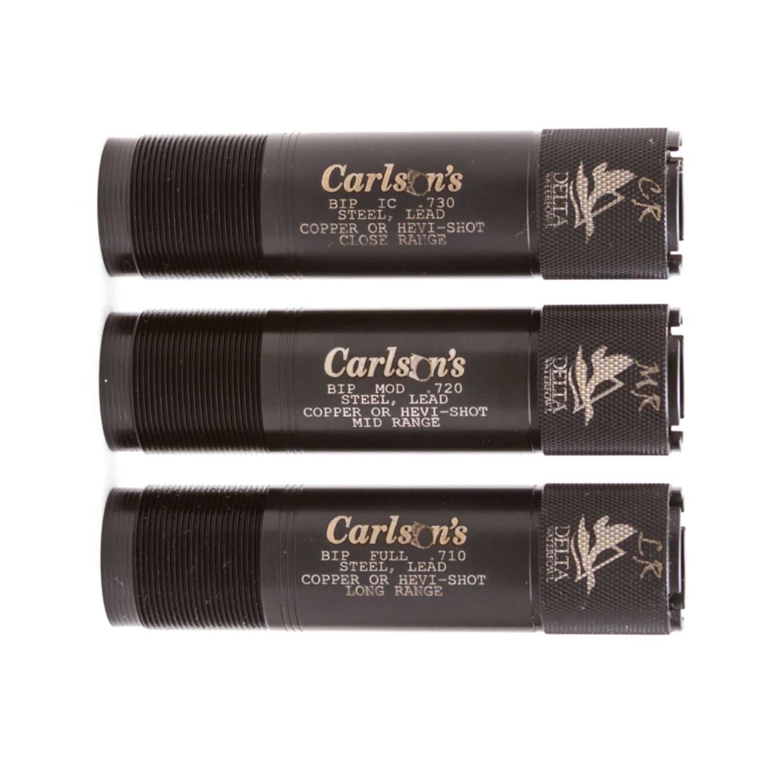 Carlson’s Delta Waterfowl 12ga Choke Tube Sets are manufactured from 17-4 stainless steel and are designed to throw tighter and denser patterns than conventional choke tubes. These choke tubes feature a 25 percent longer parallel section in the choke, thus throwing more consistent patterns. Each choke tube is knurled on the end to allow for quick and easy removal and has the constriction and type laser marked on the end and body for easy reference. steel shot may be used through these choke tubes with exceptional results. Do not shoot steel shot larger than bb or any steel load faster than 1550 fps through the long range constriction. Loads that exceed this size and speed should be used with the mid range choke tube. These choke tubes come as a set of 1 long range, 1 mid range, and 1 short range and fit Browning Invector Plus models.