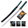 The Dragonfly Katana is a beautiful sword with a distinctive teal-green silk cord-wrap and black sam? (ray skin) handles, complementing rich iron furniture with a dragonfly motif. Their deeply curved and hand polished 1060 steel blades terminate in a long ?iris leaf? point for maximum cutting potential. Additionally, these swords come with two protective bags. A blue cotton travel bag and an intricately decorative display bag made from the finest heavy silk brocade.
