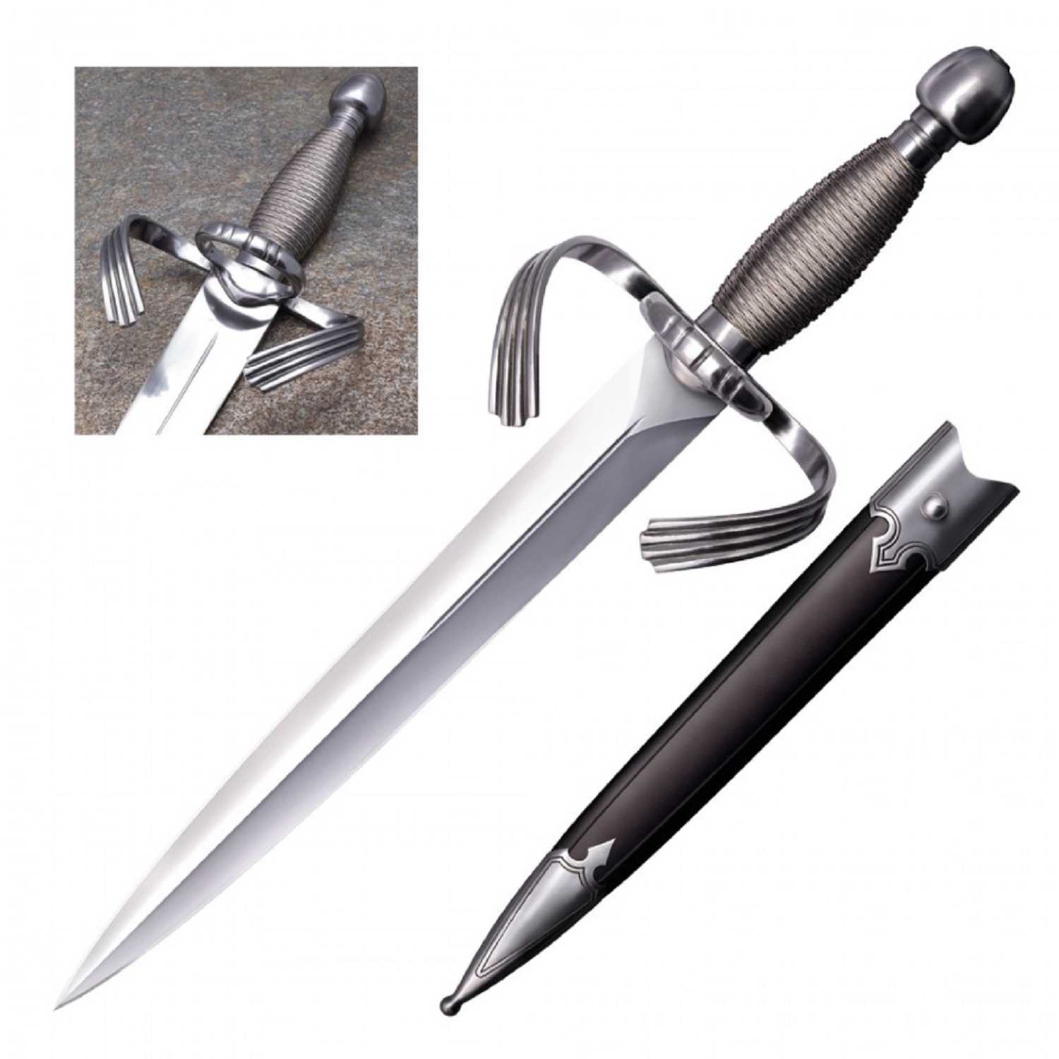 Made to be equally useful for offense or defense – it sports a long think, wide blade that is stout enough to oppose the heaviest sword. It remains equipped with extra sturdy down turned quillions and a generous side ring. Delivered fully polished, sharpened, and encased in a thick black leather scabbard embellished with a decorative throat and chape.