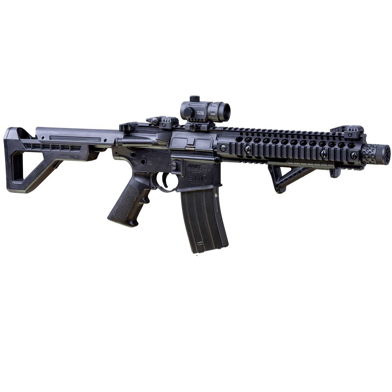 This compact Crosman Full Auto BB Rifle shoots over 1400 rounds per minute. Featuring Blow Back action and has a 6 position adjustable butt stock. It includes a 30 round magazine, an AR compatible pistol grip and a quad rail forearm for accessory mounting. Also a flip up back up iron sights.
