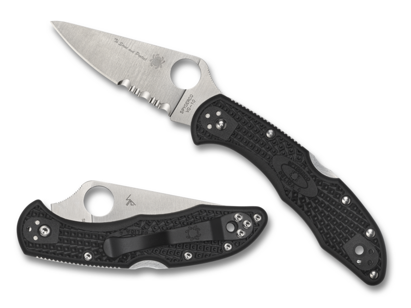 fiberglass-reinforced-nylon handle scales of this knife are injection molded in black accented by a bright blue lining. laser engraved with the motto To Serve and Protect