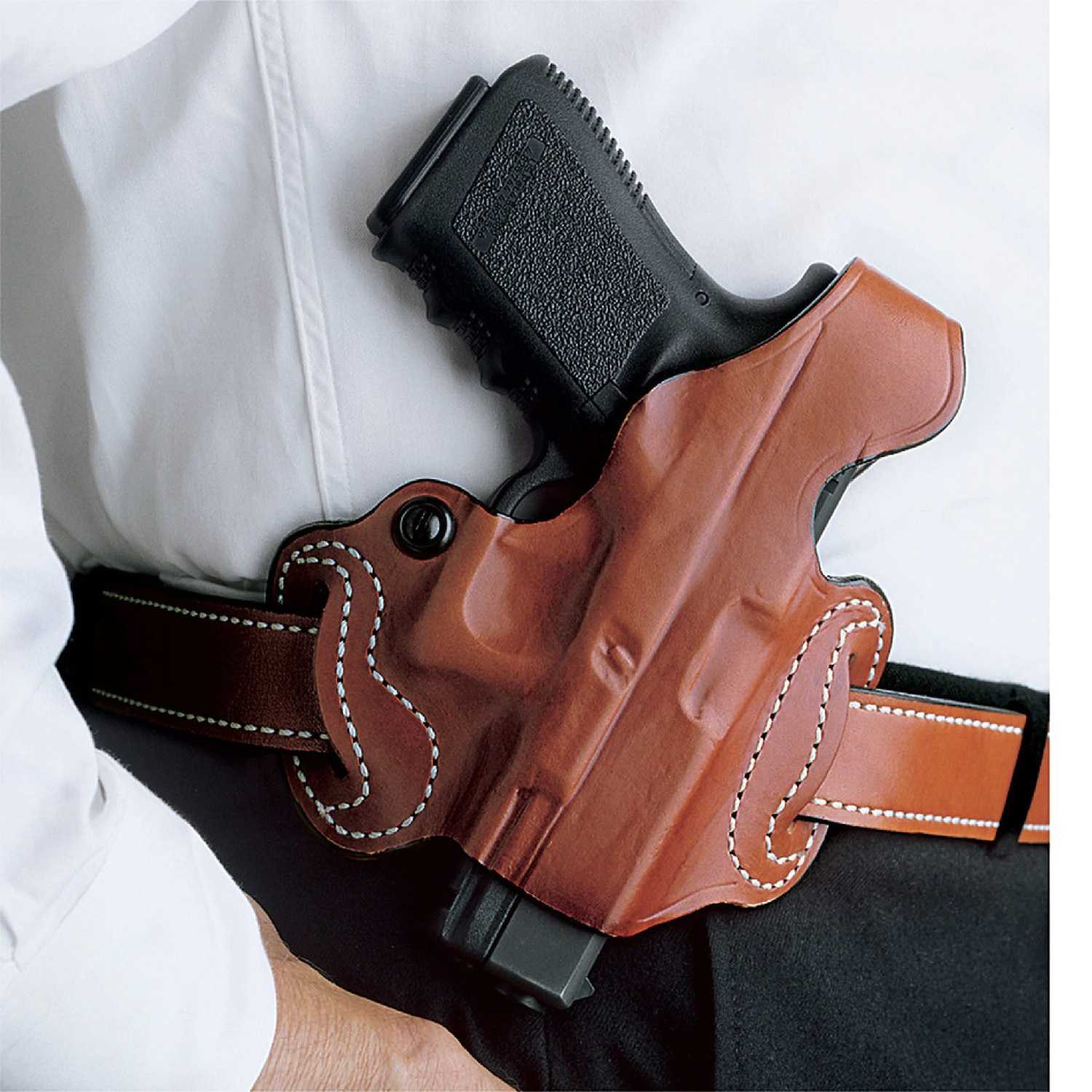 “The Thumb Break Mini slide holster features premium saddle leather, double seams, a highly detailed molded fit, and an exposed muzzle. Also features an adjustable-tension device. The two-slot holster accommodates belts up to 1-3/4″” wide. Made in the USA.”