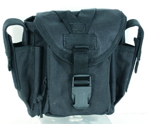 The Dump Pouch from Voodoo Tactical does exactly what the name suggests–provide a convenient and portable space to dump spare magazines, loose rounds and miscellaneous items. A drawstring extended collar keeps contents secure while allowing a wide-opening for easy rummaging through contents. The flap cover secures with a quick-release buckle for instant access to the main compartment. The pouch carries two side-mounted pistol magazines. These mags are retained with the adjustable flap covers that flexibly adapt to varied magazine sizes. The pouch incorporates a pair of pen slots on the front for ready use when taking notes for data sheets. Voodoo’s universal straps allow for attachment to a range of webbed platforms offering incredible versatility and convenient carry.