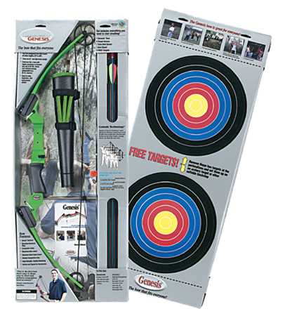 “The Genesis System combined “”zero let-off”” with light draw weights to create a bow that covers all standard draw lengths and fits virtually everyone. This bow has just one cam which means no tuning problems, much less recoil, more accurate shooting, and less noise, and because there’s no specific requirement for draw length, kids will never outgrow the bow, they won’t develop bad habits due to an ill-fitting bow, and everyone in the family can use the same bow. The kit includes the Genesis bow, color coordinated belt tube quiver, adjustable armguard, five aluminum arrows, two target faces and the informative owners manual.”