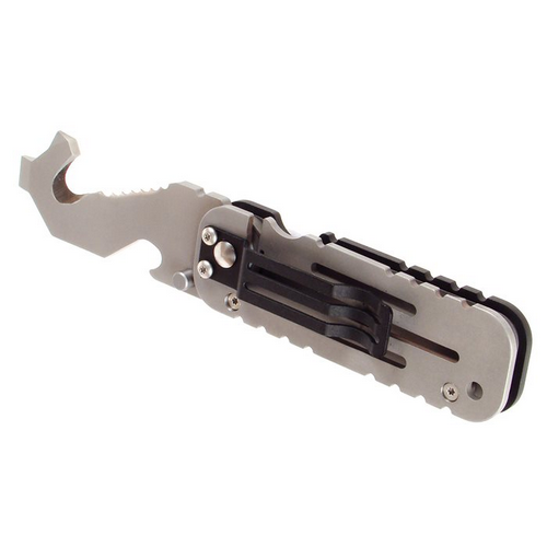 Recessed blade slices seatbelts and cord easily Flat screwdriver, wire stripper and bottle opener for utility use Handle includes glass breaker for emergency escape and rescue