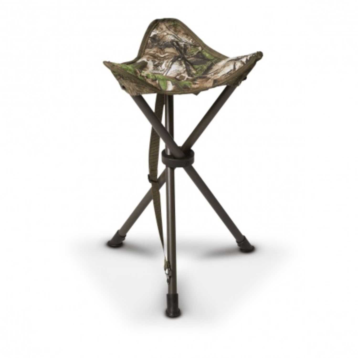 Realtree Edge Camo Hunting tripod field stool. Steel tube construction. Includes carrying strap. Perfect for keeping your rear-end out of cactus, wet snow, and off of sharp rocks. Allows you to be elevated enough to see over low brush and spot approaching predators. Lightweight (2 lb 8 oz), opens and folds in seconds