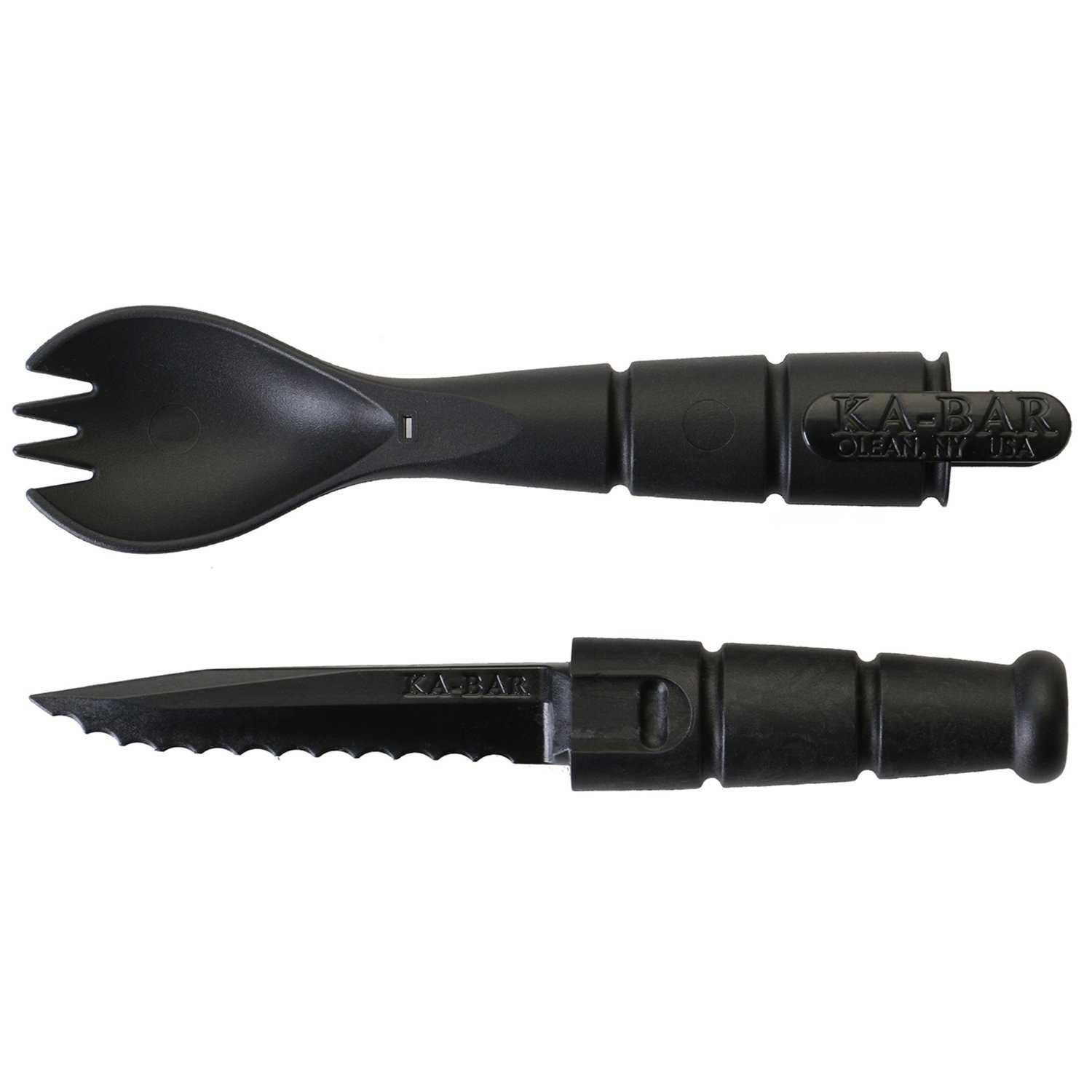 The KA-BAR Tactical Spork is an eating utensil complete with a spork and removable knife. The tactical spork is lightweight, compact, convenient, and made in the U.S.A from FWA materials, safe for food and water. Firmly grip each end of the utensil and pull apart to remove the serrated knife blade. For compact storage, slide the blade back into the handle until it clicks securely into place.