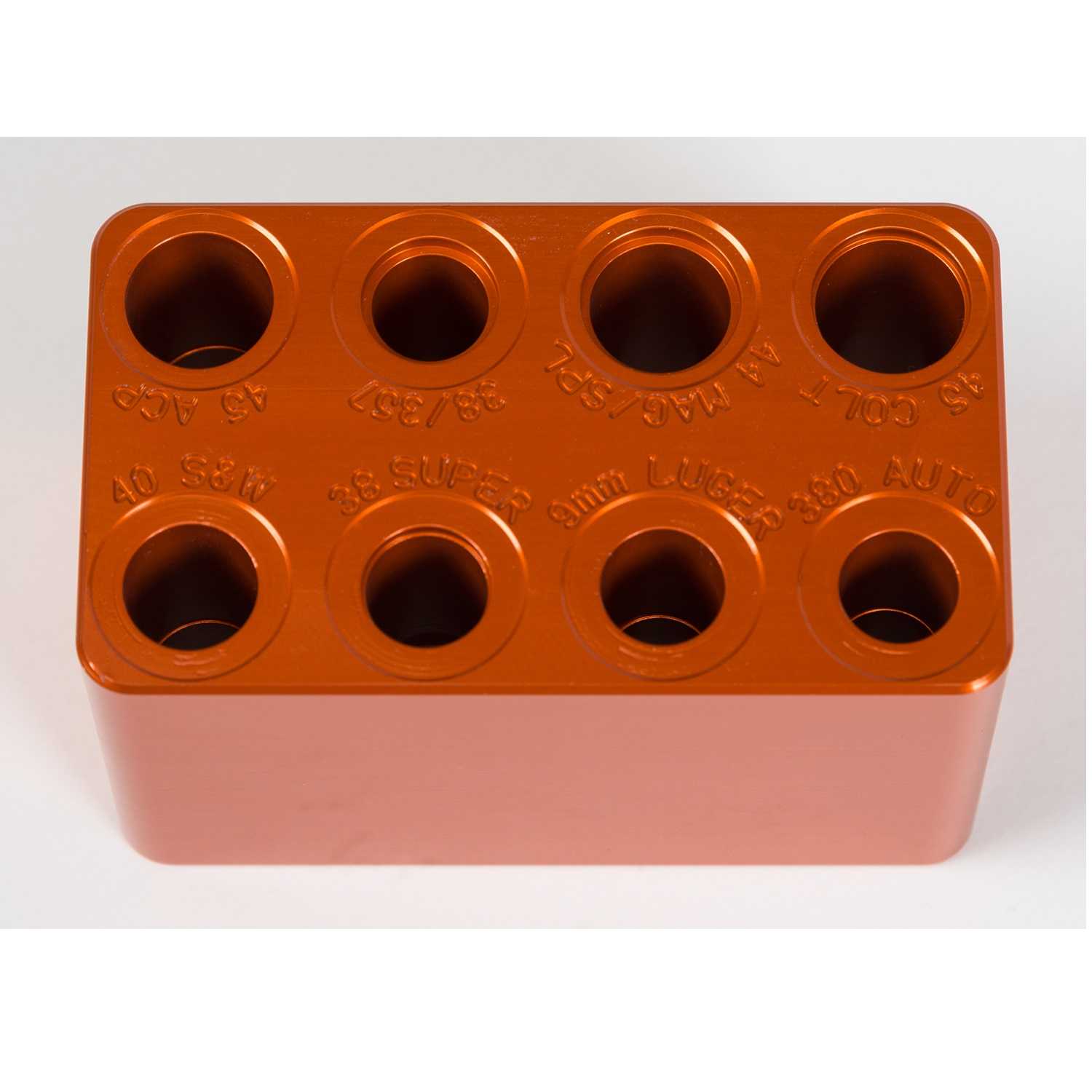 These Ammo Checkers are gauges that allow a reloader to quickly confirm that their ammunition will fit in their chamber. Machined from solid blocks of 6061 T6 aircraft grade aluminum and cut with custom tooling to SAAMI minimum chamber dimensions. One gauge will work with a variety of calibers. Just drop your loaded rounds into the ammo checker, and if the round fits into the gauge, it will fit in the gun’s chamber. Each caliber is clearly engraved on the gauge. Bright orange anodizing makes them easy to find on your reloading bench.