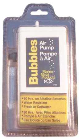 “Marine Metal Products Bubbles air pump has a precision motor that runs 85 hours on 2 alkaline “”D”” cell batteries. Booted waterproof switch. Weighted glass bead airstone with 30″” of air line tubing.”