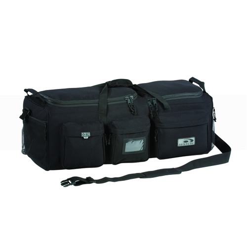 Designed to carry riot or SWAT gear and includes a separate helmet storage area Water-resistant Cordura nylon Heavy-duty zippers and removable nylon web shoulder strap Removable rigid bottom in the main compartment and padded exterior walls in the helmet compartment Three zippered cargo pockets and two zippered mesh pockets on the exterior hold a wide variety of items Nylon web carry handles are on both the sides and ends Hook and loop straps on the padded top can secure a baton or flashlight Weight: 3.60 lbs. (57.6oz.), 1.63kg Exterior dimensions: 34L x 13W x 12H (86.4cm x 33cm x 30.5cm) – Large interior compartment: 20L x 13Wx 12H (50.8cm x 33cm x 30.5cm) – Small interior compartment: 14L x 13Wx 12H (36cm x 33cm x 30.5cm)