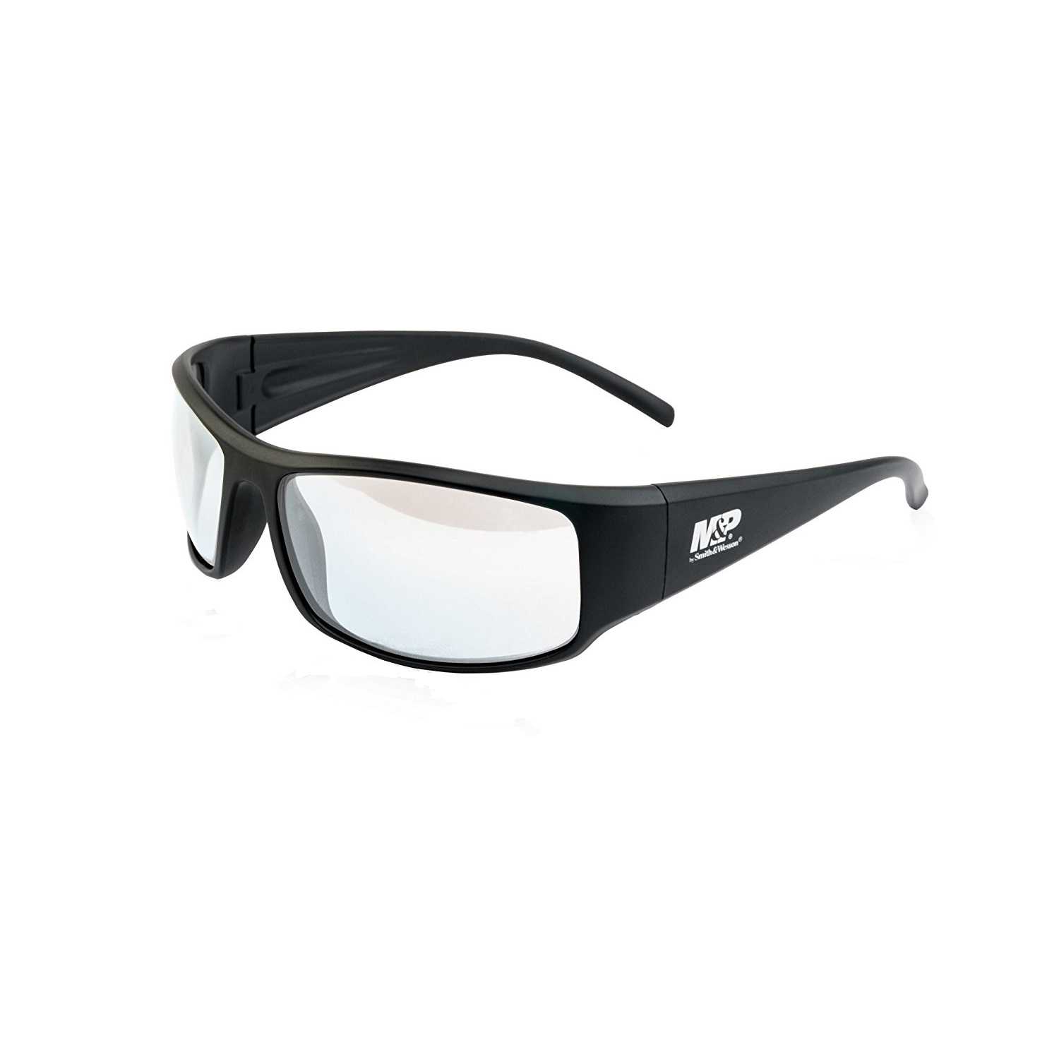 M&P Thunderbolt Full Frame Shooting Glasses Matte Black/Clear Mirrored Lens give full peripheral eye coverage. Lenses are anti-fog with a non-slip rubber nose and ear pieces with non-reflective matte black frames. Hard zippered storage case with microfiber cloth included. Matte Black/Clear Mirrored Lens