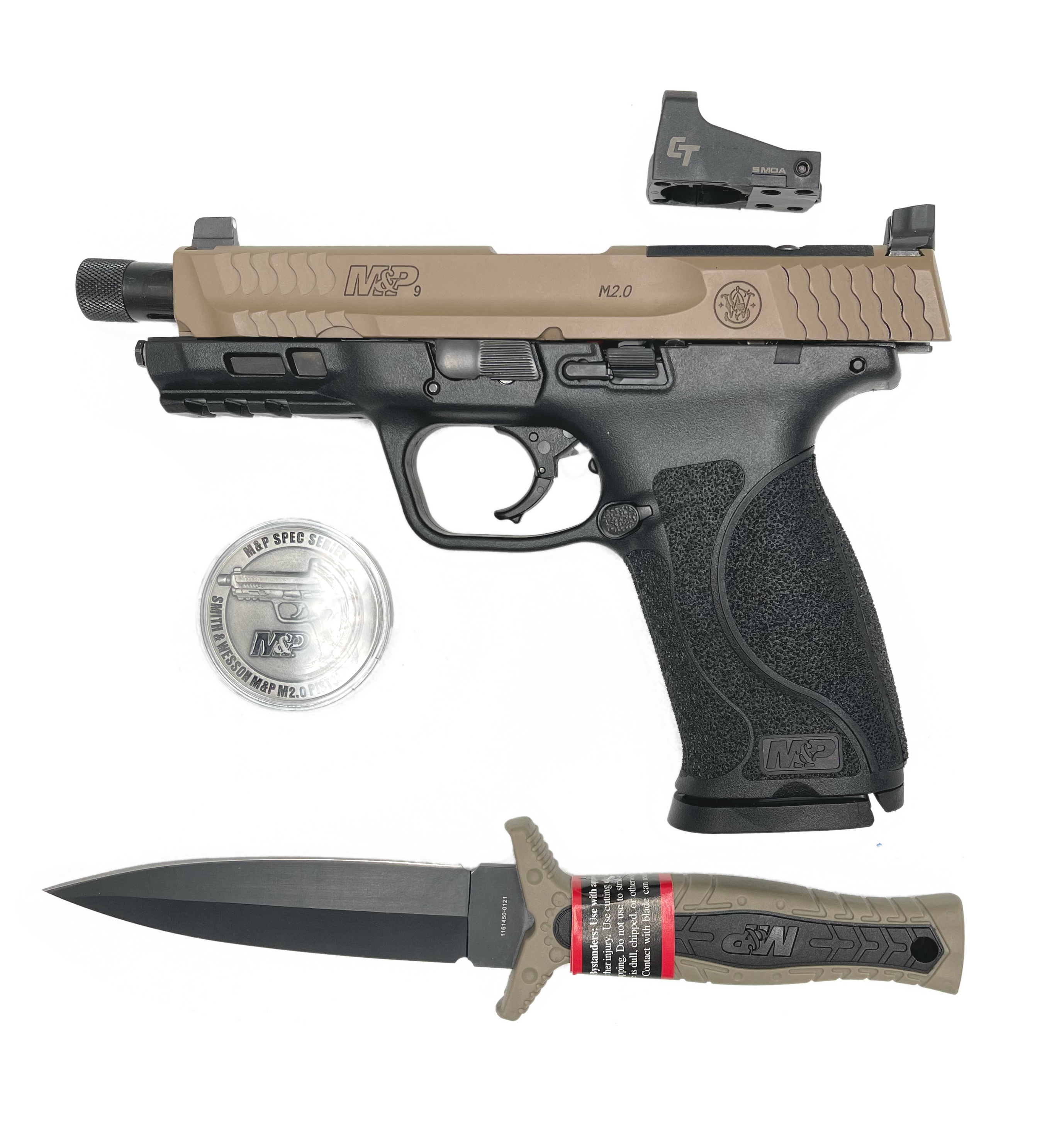The new Spec Series Kit from Smith & Wesson includes an M&P9 M2.0 optics-ready Spec Series pistol, an M&P single-edge, spear point knife, and a new M&P Spec Series challenge coin. The M&P M2.0 OR Spec Series pistol features a 4.6” threaded barrel, suppressor height night sights, an optics-ready slide and a Crimson Trace CTS-1500 red dot optic. Features M&P9 M2.0 OR Two-Tone Pistol 4.6” Threaded Barrel (1/2 x 28) Optic Ready Slide Suppressor Height Night Sights Two 17-Round 9mm Magazines M&P Full-Tang Fixed Blade Boot Knife M&P Spec Series Challenge Coin Custom Fit Plastic Case