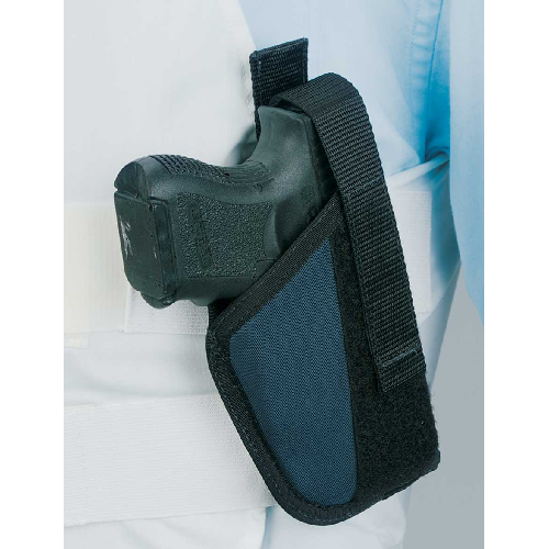 Smooth interior prevents damage to firearm finsih Hook-n-loop retention strap keeps firearm secured Velcro backing secures to bulletproof vests Reinforced perimeter binding delivers maximum durability Strapless design offers custom positioning