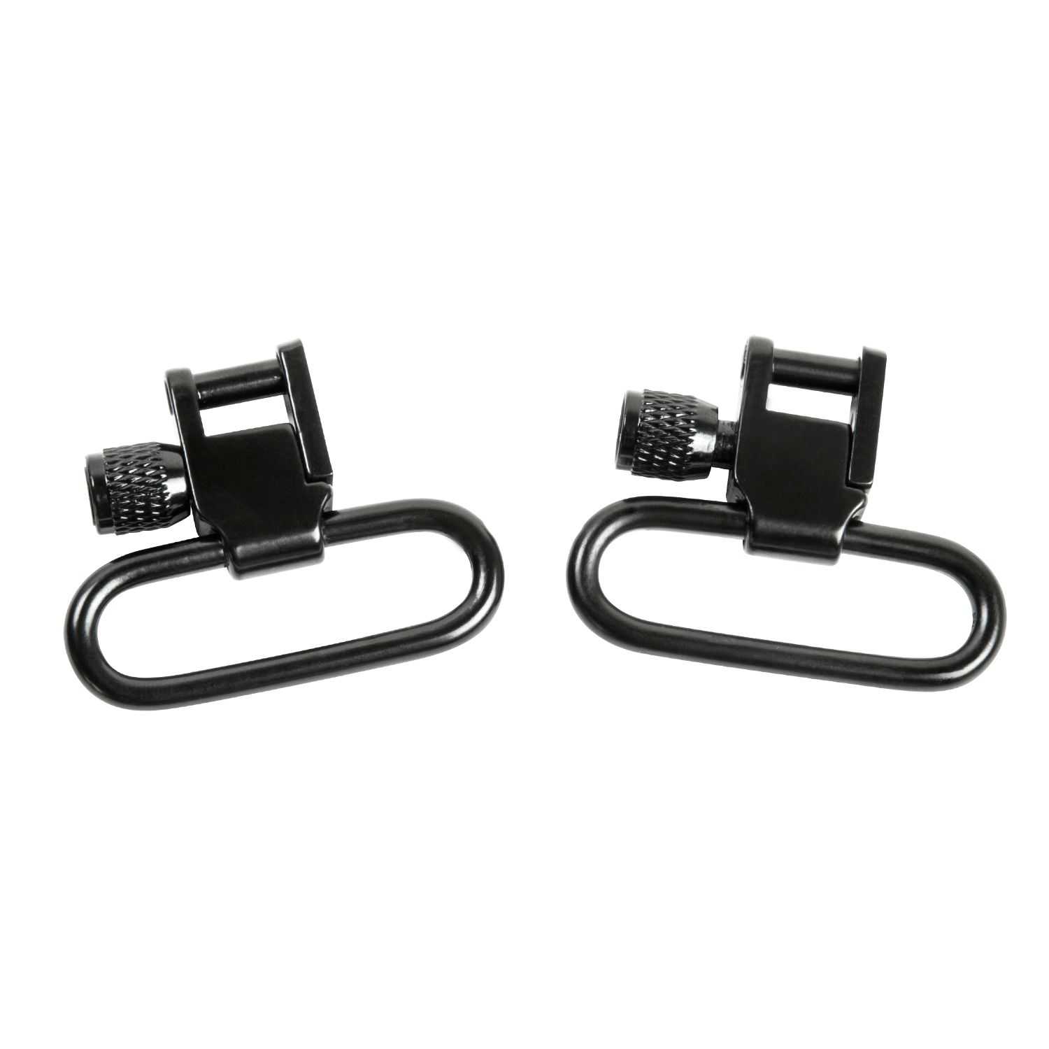 The NcSTAR 1 inch Lockable Sling Swivel Pair mounts onto most standard sling studs found on most hunting rifles and shotguns. To unlock them, unscrew the knurled thumb nut, push in, and rotate side are 90 degrees to open sling swivel mount. Place the bar through sling stud on long gun, rotate side arm over the bar and screw in the knurled thumb nut to lock the swivel mount. They have a metal construction and are painted black. These sling swivels are 1.25 inches long and 1.6 inches wide and weigh 0.4 ounces each.