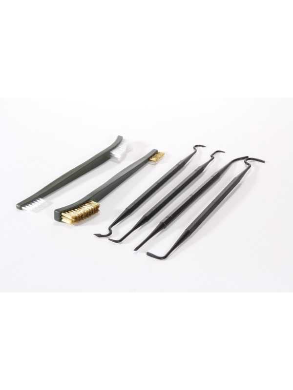 The picks come in a variety of shapes so that you’ll have just the right size to fit into those tight spots. Both brass and nylon utility brushes are also included for scrubbing away tough powder residue. A must have for your cleaning supplies and range bags.