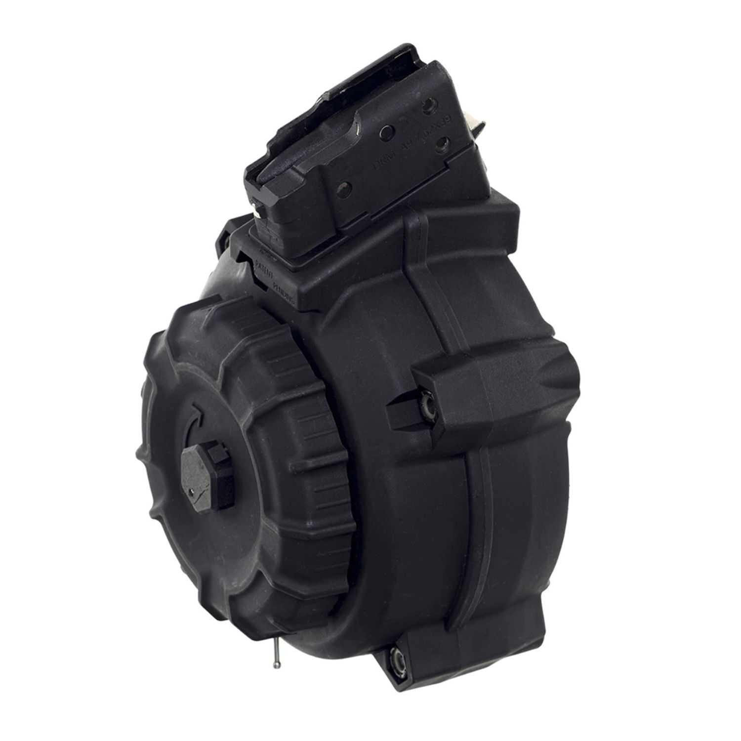 The ProMag AK-47 7.62x39mm 50 Round Drum Magazine fits most common variants of the Kalashnikiov in 7.62x39mm. It features over molded stamped steel feed lips and front and rear magazine catch. The magazine body is constructed of a proprietary DuPont Zytel based polymer with an injection molded magazine follower. The magazine spring is formed from heat treated chrome silicon wire. This magazine does not fit unconverted Saiga rifles and is made in the USA.