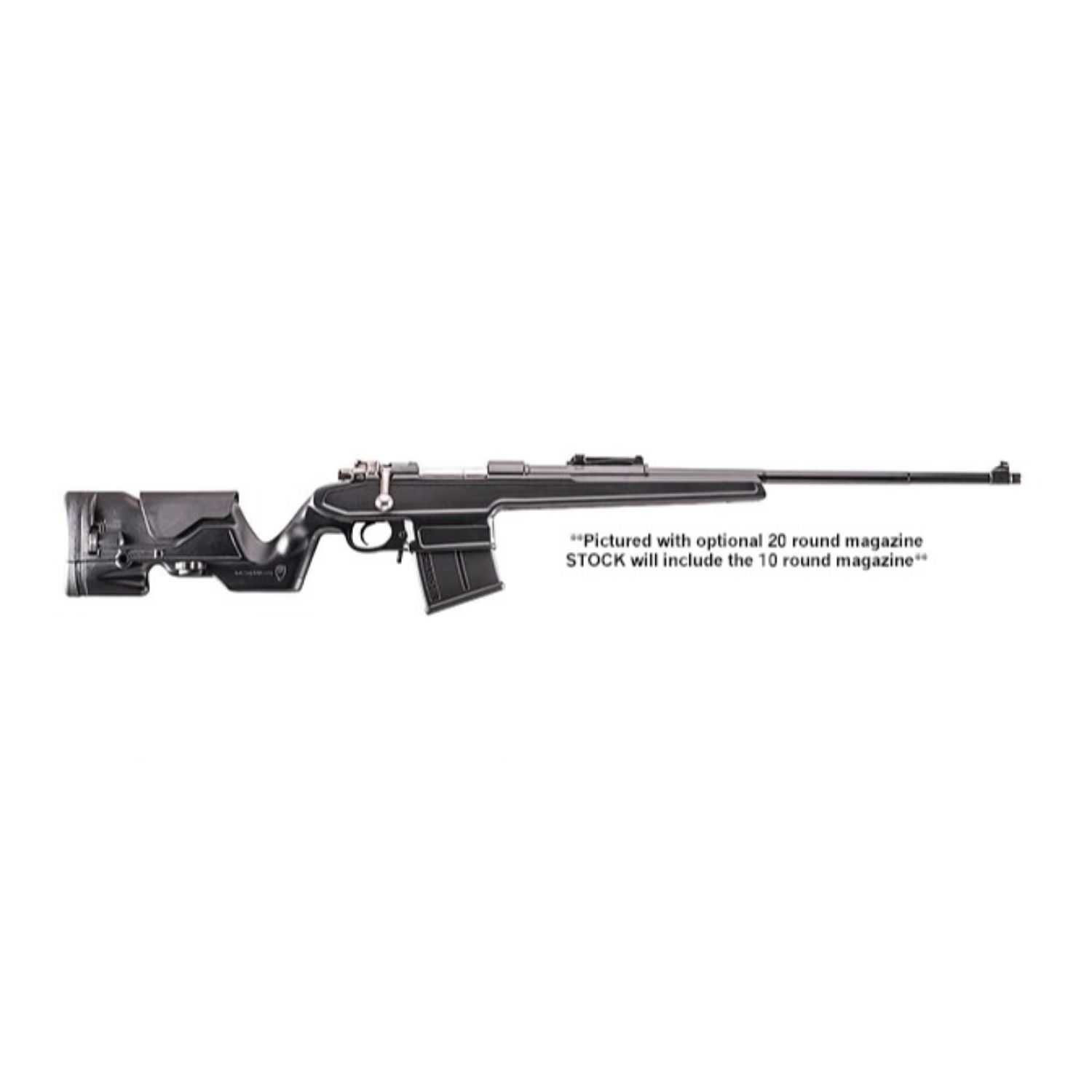The ProMag Archangel Precision Stock Mauser K-98 Variants with 10 Round Magazine fits the classic Mauser K98 rifle and variants including most Large-Ring, German K-98?s, Czech VZ-24, Yugo 48 48a, Turkish 1903, 1937, 1938, 1946 7mm or 8mm caliber. This lean and mean next generation stock looks great, is loaded with features and solidly brings the K98 into the 21st Century with an integral mag well and detachable magazine. The precision inlet with steel pillar bedding, free-float barrel channel, fully adjustable ergonomics, patented barrel pressure device, and ergonomic gooseneck style grip with palm swells promote maximum accuracy. The grip also has a locking storage compartment. The buttstock features a click adjustable length of pull of 13.5 to 14.25 inches and click adjustable cheek riser of .05 inch increments with 1.5 inches of travel. Three steel hardpoints accept QD style sling swivels. The sling swivels are not included. The forend and inlet it designed to perfectly fit and float surplus military contours, can be opened up for heavier barrel contours and includes our patented barrel tensioner for those barrels that like prefer some pressure. It is pre-inletted to accept Timney Trigger part 301, use the 301 for small to average size hands, or 302, with 0.375 inch longer length of pull. Use the 302 for larger hands or longer fingers. It includes hex head action screws and the required Allen wrench. Constructed of legendary high strength, carbon fiber and glass reinforced black polymer, the precision stock is tough as nails and will withstand a lifetime of hard use. It includes one black polymer 10 round TYPE B magazine and a 5 round limiter. It will not fit large ring Swedish M-38 96 6.5 x 55 or small ring Mausers.