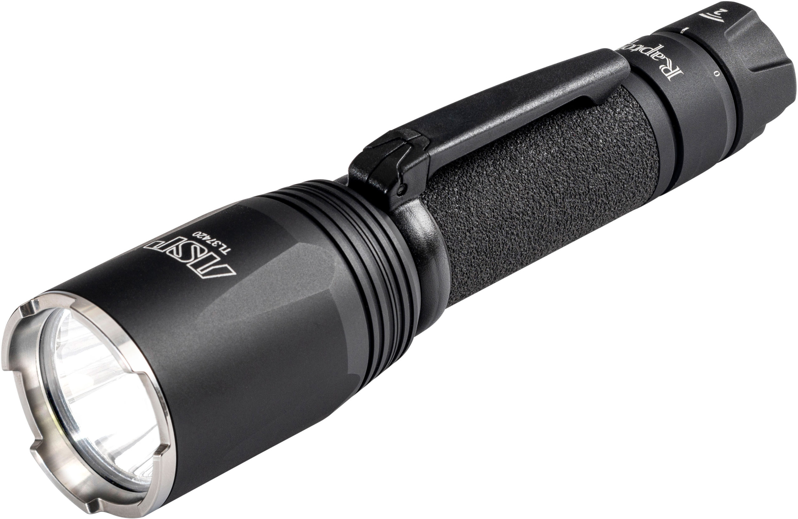 Activation is rapid and positive. The Raptor employs advanced circuit board technology with an extremely quiet, self-cleaning computer microswitch. The switch circuit is redundant with two contacts in each position to assure positive activation. The Softouch extended activation button is overmolded to provide improved contact. The Raptor employs a high output thermally controlled LED. The light source has its own parabolic reflecting chamber. The resulting output is blindingly bright. It provides a room illuminating halo of light while projecting a penetrating central beam of incredible intensity.