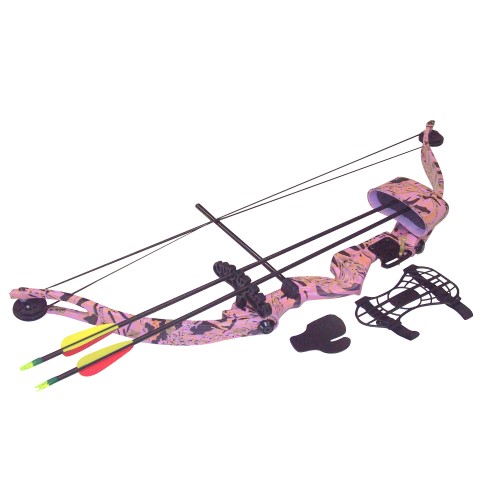 The SA Sports Majestic Youth Recurve Compound Bow Set combines style and functionality with pink camouflage and lightweight molded limbs. This bow features a sight bracket with a brass sight pin, and a replaceable arrow rest. The full-size integrated quiver comes with 2 target arrows ready for practice. The set includes an arm guard and a finger tab for the comfort and safety of youth hunters while they learn. The bow has a 20 pound draw weight and an adjustable draw length to suit your growing young archer.