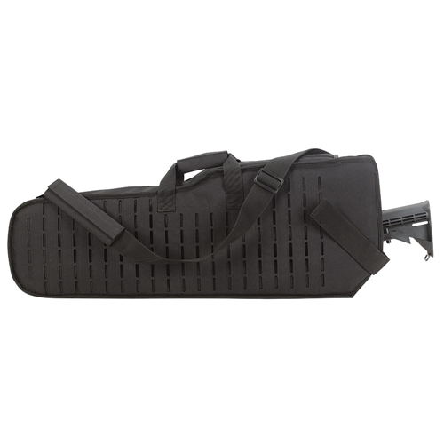 The scabbard will hold sniper rifles and other long guns that have a 20-24 inch barrel and scopes that have a 56mm objective lens or smaller. The scabbard has the new MOLLE system that is sleek and will be able to accommodate the different punch configuration and needs for each individual shooter. It also has back pack straps along with the shoulder sling.