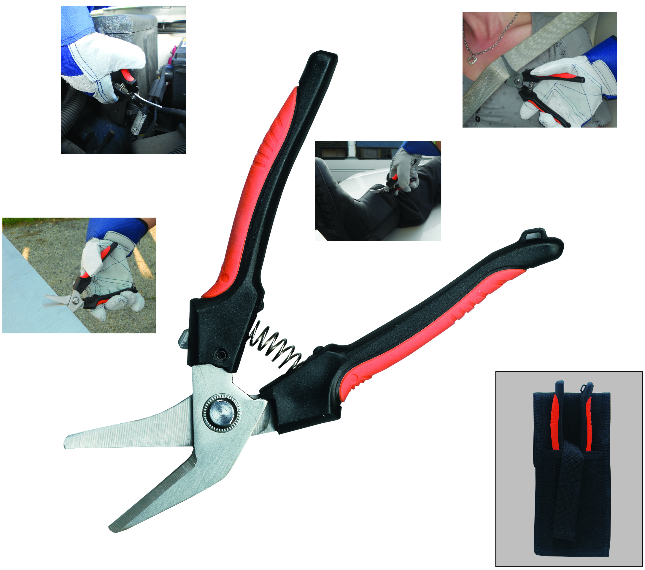 Shear Power has an angled hardened stainless steel blade with a comfortable spring load non-slip rubber handle. The spring action in the shears increases torque without straining your hands. It can easily cut through wire, cable, leather, webbing, etc. Shear Power has thumb-operated lock to ensure that the blades are not exposed, and that the handles lock for safety when stored or when not in use.