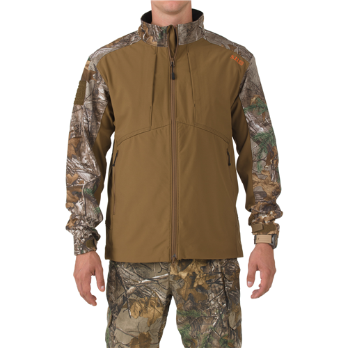 An update to our popular Chameleon Soft-shell Jacket, the Sierra Soft-shell in REALTREE X-TRA Colorblock camo offers lightweight weather protection that excels in a wide range of adverse climates. Constructed from 100% polyester stretch fabric bonded to polyester micro fleece, the REALTREE Colorblock Sierra Soft-shell Jacket features a DWR (durable water resistant) finish that repels wind and moisture while remaining breathable and flexible, and incorporates the 5.11 RapiDraw system for easy access to an interior pocket or a concealed firearm. Low-profile chest pockets stow your phone or accessories, lined handwarmer pockets keep your fingers responsive, the adjustable hem ensures a snug fit, and premium YKK zipper hardware ensures quick and precise action in any environment.