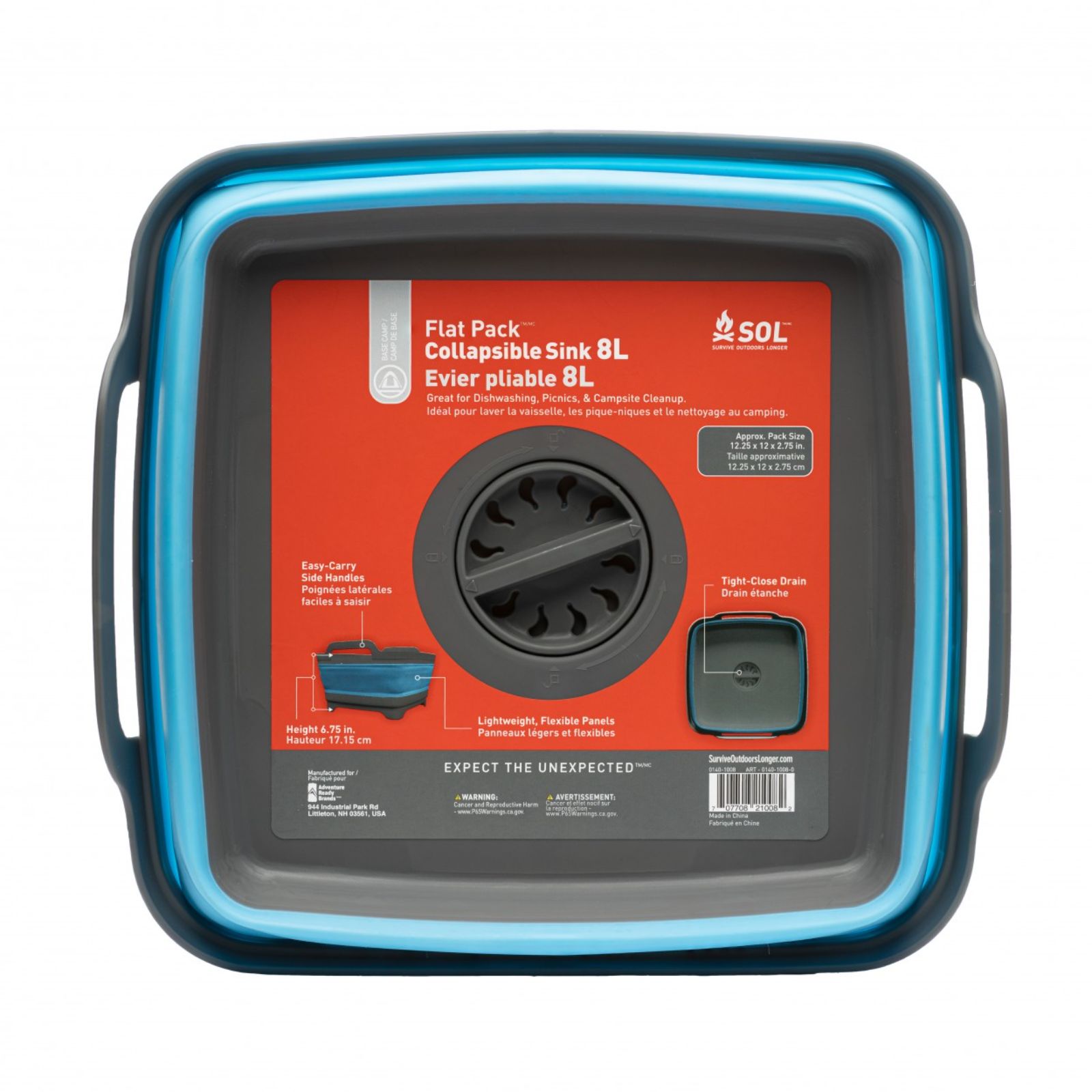 Be campsite ready for anything with the?SOL?Flat Pack?Sink 8L.?Washing up after a big meal??Pop open this sink for easy clean up.?Turn the drain in the base to empty dirty water with ease.?Plus, with dual carry handles, this sink converts to a basket to carry?all your supplies.?Ready to hit the road? Collapse and pack this sink flat.?Any campsite meal or mess can easily be tackled when you have the right tools for the job.