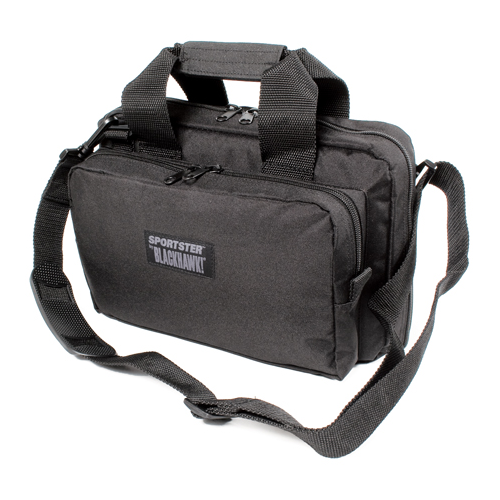 The Blackhawk! Sportster Deluxe Range Bag is a rugged case offering ample storage for handguns, ammo and safety gear. Made of 600 denier polyester with a PVC laminate, the bag integrates a dual slider top that opens to a large central storage compartment with varied interior pockets to organize essential gear. Specialized interior pockets accommodate up to two handguns and are lined with soft fabric to protect the firearms’ finish. External side compartments provide additional storage space, one with inner mag pouches, the other with a removable padded handgun bag that fits in either side. An exterior slash pocket holds keys and a cellphone. Exterior MOLLE webbing offers further customization options for attachment of MOLLE compatible accessories and pouches. Sturdy reinforced handles and a removal shoulder strap provide versatile carry options that balance the weight load.