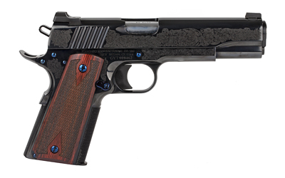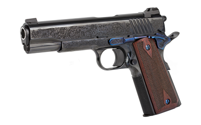 Standard Manufacturing Company 1911, Semi-automatic, Full Size, 45ACP, 5″ Stainless Steel Match Grade Barrel, 4140 Carbon Steel Frame, Blued Finish with Deluxe #1 Custom Engraving Pattern, Rosewood Double Diamond Grips, 7Rd, 1 Mag, Right Hand, Thumb Safety, High Profile Low Mount Tactical Sights 1911B1