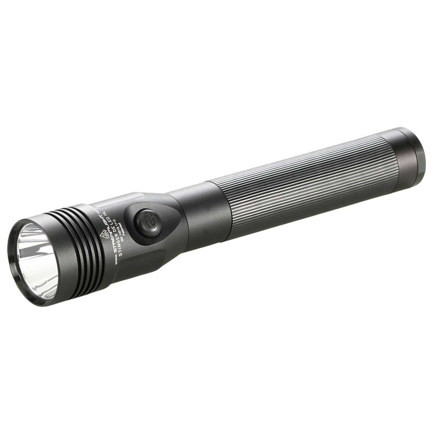 The 800 lumen Streamlight Stinger DS LED HL Rechargeable Flashlight with Dual Switches is a high lumen flashlight with a wide beam pattern that gives you a bright flood light that will light up the area around you. Its beam reaches 310 meters, and with a switch on the head and a switch on the tail, you have multiple power up options. It is ideal for law enforcement, security, and professional use.