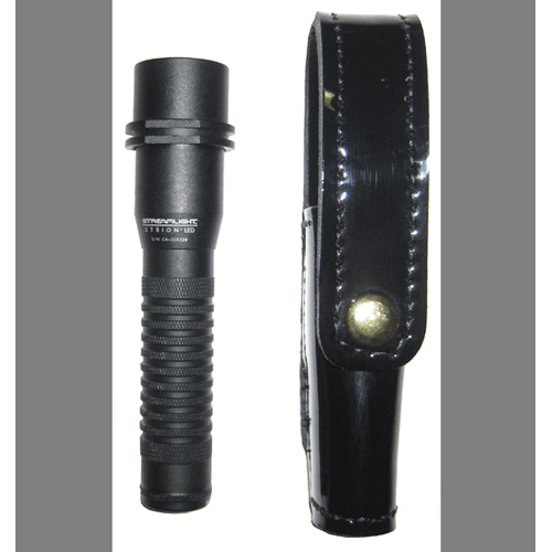 Covered flashlight holder w/ anti-activation taper fits: Streamlight Strion LED. 100% US genuine leather sewn with the weltless corner stitch. Fits belts 2 1/4 or smaller. DOT brand fasteners.