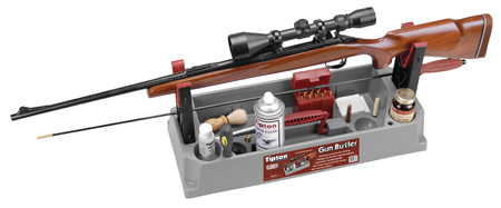 Two removable non-marring forks hold the gun securely in place, while thoughtfully-planned compartments and slots hold bore solvent, jags, brushes, mops, a cleaning rod, spray lubricant, and tools. Has a convenient carrying handle for easy transport.