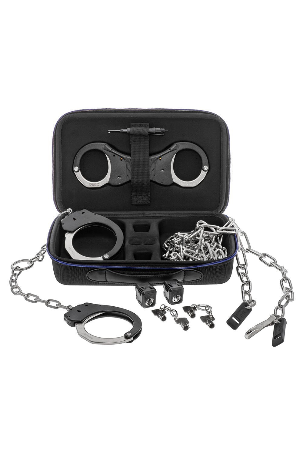 Complete wrist and ankle restraint system Apply/remove chain without removing cuffs Includes cuffs, chain, locks, keys & case