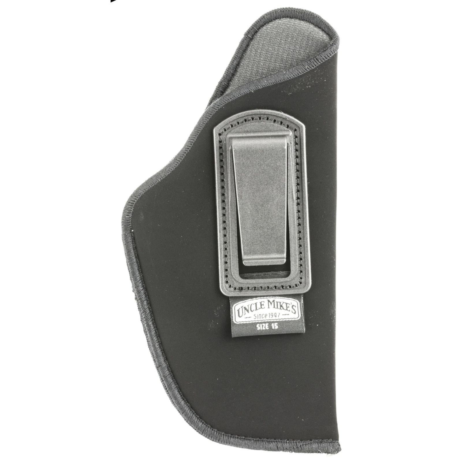 The Uncle Mikes OT ITP Holster Large Frame Auto Size 15 RH Black is a unique, ultra-thin four-layer laminate no thicker than conventional suede leather holsters. An internal moisture barrier won’t transmit perspiration to gun. The suede-like exterior helps anchor holster inside pants or skirt. The belt clip slips over pant top and belt to hold gun securely and anchor gun for positive draw. The holster is size 15 and fits large frame autos with 3.75in to 4.5 in barrels.