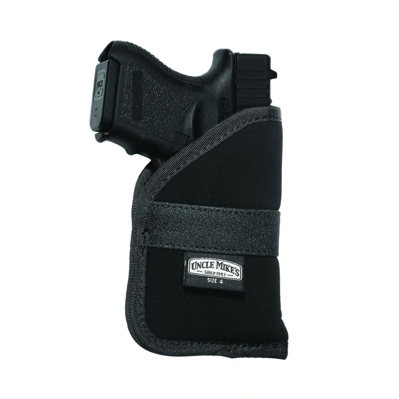 The Uncle Mikes OT Inside The Pants Holster Size 4 Ambi Black are a great option for those who prefer to not tuck their holster inside their waistband yet still want to carry concealed in comfort. The laminate lessens print-through recognition, cushions your leg, and blocks perspiration and the non-slip band retains holster in pocket when gun is drawn. The open-top holster provides grip-up positioning and prevents the movement of levers, buttons, or catches that are common to loose pocket carry. The non-slip band retains holster in pocket when gun is drawn and the gun rides upright for a clean draw and is protected from lint and debris inside pocket. This holster fits most sub-compact 9mm and .40 autos.