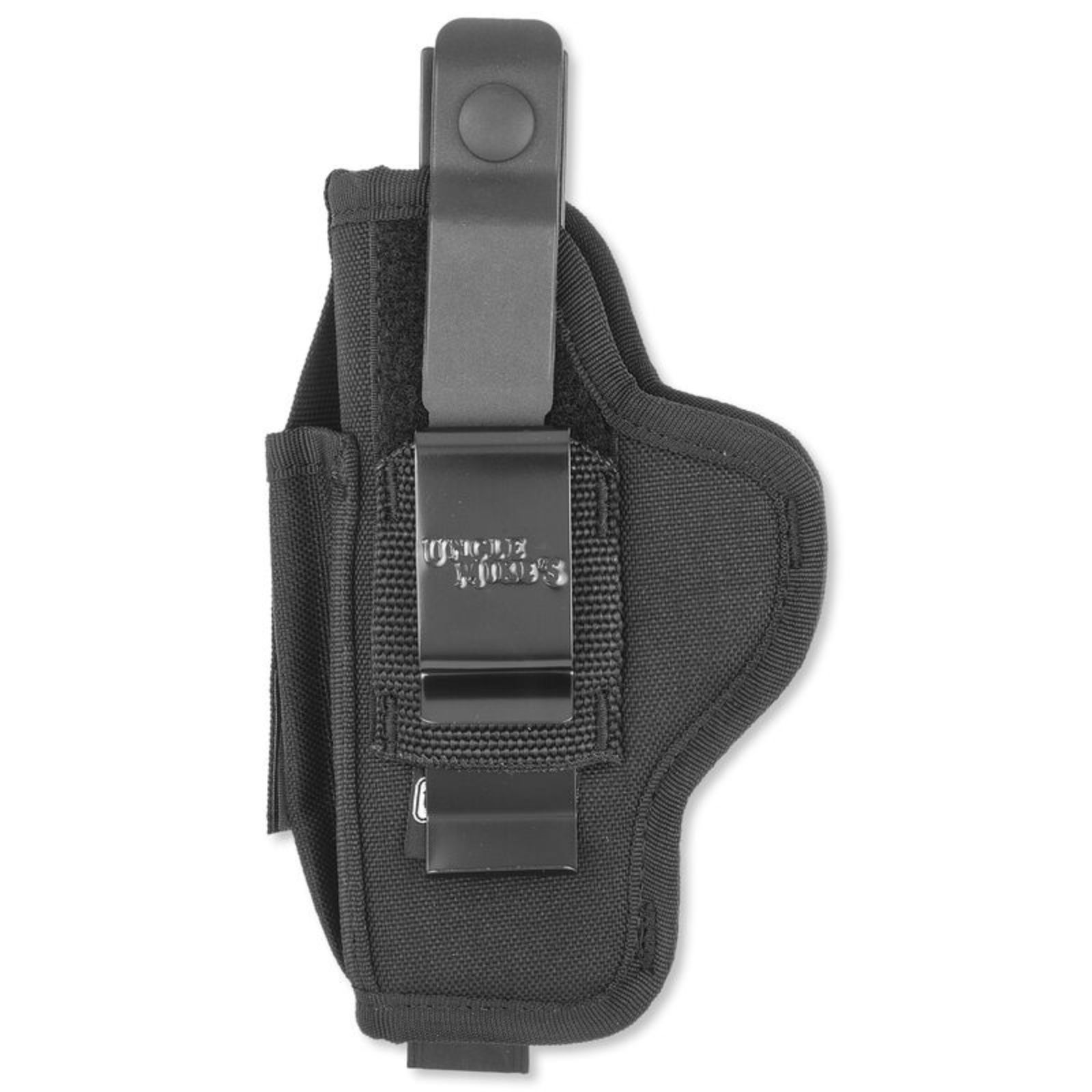 Uncle Mike’s pioneered the use of nylon in holsters more than 20 years ago and truly revolutionized the industry. Through countless days in the field with hunters, law-enforcement agencies and the military this incredibly tough, tightly woven material has proven itself up to the test.?Uncle Mikes Sidekick Holster Kodra Blk Sz15 Ambi w Mag Pouch gives the user a two-in-one option; thanks to a reversible belt clip, this holster can be worn either inside-the-waistband or outside-the-waitsband. It features a secure, non-stretch hook and loop retention strap and molded thumb break keep your firearm snug. It includes a strap trap adjustment tool and has a durable, tough, patented Kodra laminate with padded, waterproof interior. The spring steel belt clip is powder-coated for corrosion resistance. This holster fits 3.75 in to 4.5 in barrel large autos.