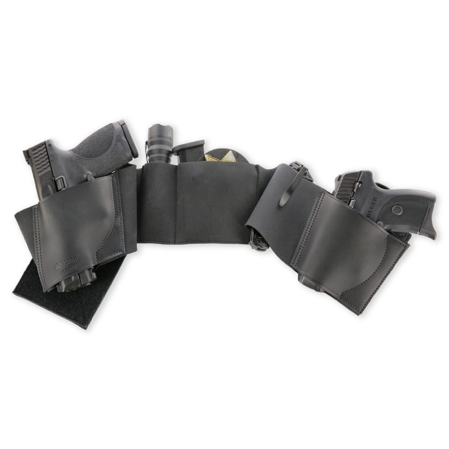 Elasticized nylon Two leather holster pockets fit most handguns Two accessory pockets Accommodates strongside, crossdraw and appendix carry