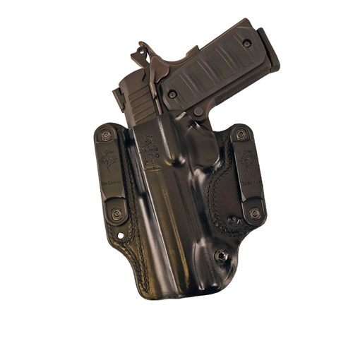 The Variable 13 is a 50/50 flat molded OWB holster made from the premium saddle leather. The flat molding makes the Variable 13 an ambidextrous holster. Removable and reversible belt loops allow wearer to adapt the holster to their preferred configuration. The Variable 13 is easily worn with a straight or FBI cant, and features an adjustable tension device. It is also compatible with the Y94 Tuckable Adaptors. Gun Fit- American Classic Classic