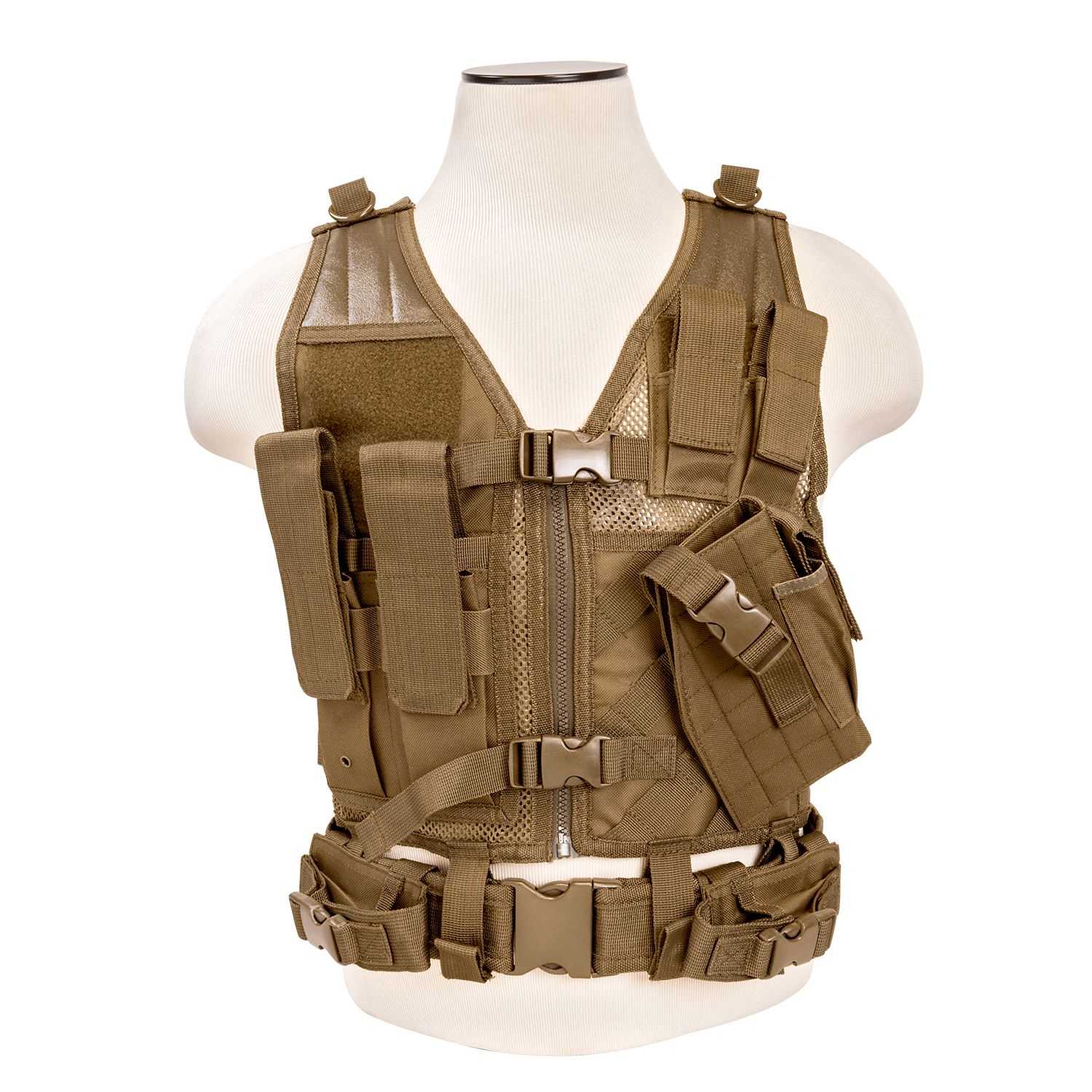 The Vism Tactical Vest XS/S is a smaller sized Tactical Vest to fit those with a smaller stature. This small Tactical Vest has many of the features that you are looking for range use or for playing MilSims. This Tactical Vest features a two pistol magazine and two rifle magazine pouches, a universal MOLLE right hand pistol holster, and an adjustable belt with two more pistol magazine pouches that can also be used for a pocket knife, multi-tool, CO2, etc. Inside the Tactical Vest are two zippered compartments and a larger rear pouch that is hydration bladder compatible. The Tactical Vest is fully adjustable: the shoulder panels feature triple panel hook and loop adjustments to adjust how high or low the vest sits from the wearer?s shoulder, and the sides are adjustable via three 1 inch straps with plastic slider to adjust to the wear?s body. The vest also features heady duty front zipper, two adjustable quick connect buckles in the front, and a mesh construction in the panels to increase the ventilation to the wearer.