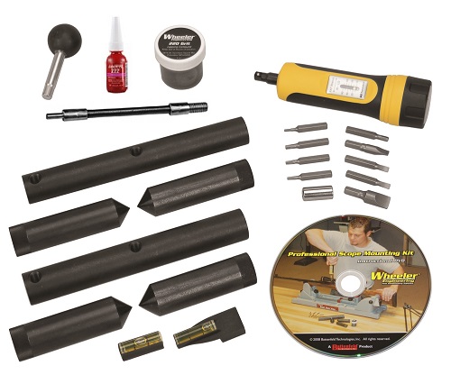 Wheelers Scope Mounting Kit features professional grade bits and the F.A.T. wrench to properly secure fasteners without deformation. Also featuring 10 gunsmithing screwdriver bits, lapping bars, ring alignment bars, for 1 inch/30MM rings, lapping bar handle, lapping compound, thread lock and an instructional DVD.