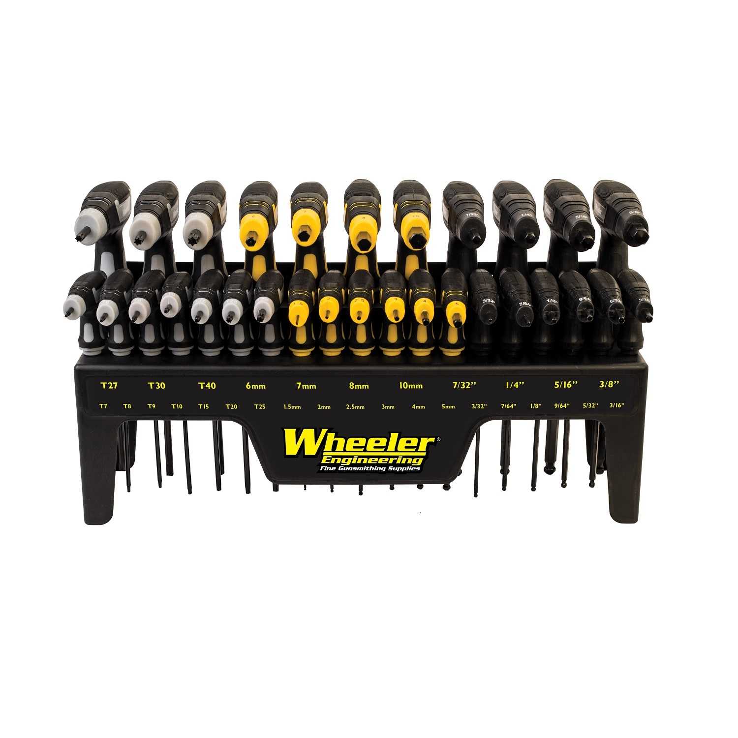 The Wheeler 30 Piece SAE/Metric/Hex/Torx P-handle Driver Set provides a molded stand that can sit on a bench or has mounting holes on the back to hang on a wall saving bench space. Includes 10 Metric Bits, 10 SAE Bits, and 10 Torx Bits. The Metric Bits include standard-1.5mm, ball-2mm, ball-2.5mm, ball-3mm, ball-4mm, ball-5mm, ball-6mm, ball-7mm, ball-8mm, ball-10mm. SAE Bits include standard-3/32in, standard-7/64in, ball-1/8in, ball-9/64in, ball-5/32in, ball-3/16in, ball-7/32in, ball-1/4in, ball-5/16in ball-3/8 in Torx Bits include T7, T8, T9, T10, T15, T20, T25, T27, T30, T40.