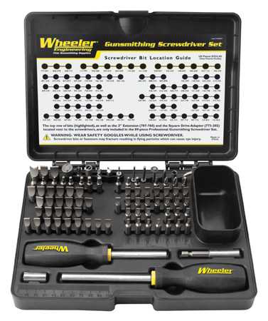 89 piece deluxe gunsmithing screwdriver set. Made from S2 tool steel and hardened to 56-58 Rockwell ?C.? The 54 Hollow-ground flat bits range from .120 x .020 to .360 x .070 inch, and includes doubles in the thinnest sizes. The set also includes a selectio